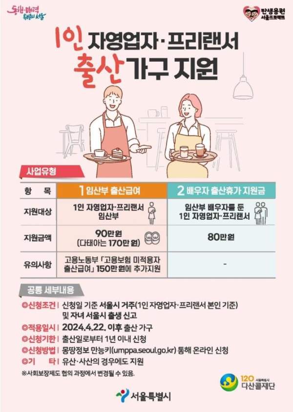 대상:024년 4월 22일 이후 출산한 배우자를 둔 1인 자영업자 또는 프리랜서 (배우자 직업 및 소득수준 무관).