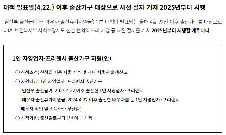 대상: 2024년 4월 22일 이후에 출산한 1인 자영업자 또는 프리랜서입니다.