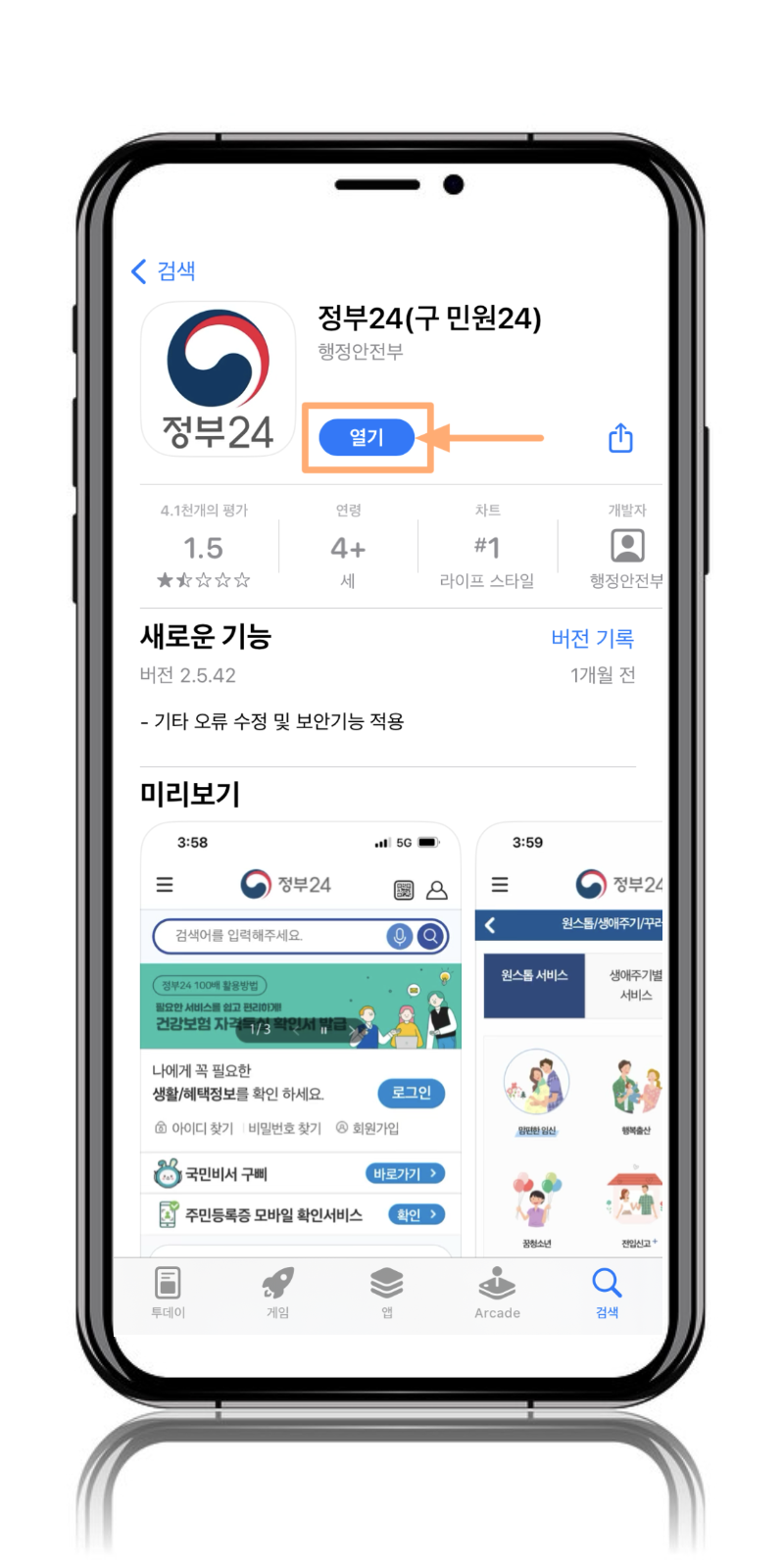 iOS 사용자: 애플 앱스토어에서 "정부 24"를 검색하여 어플을 다운로드합니다.