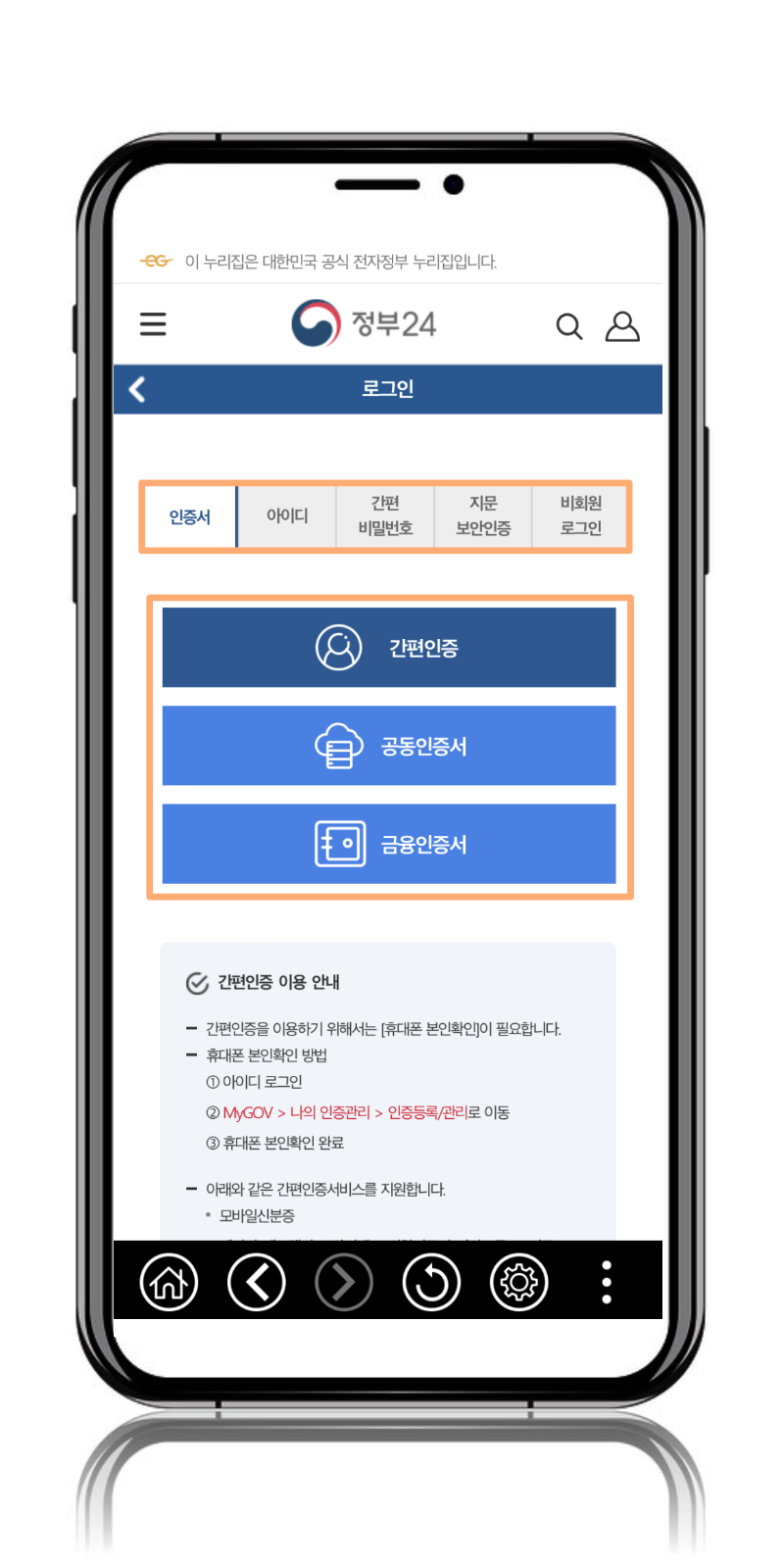 안드로이드 사용자: 구글 플레이 스토어에서 "정부 24"를 검색하여 어플을 다운로드합니다.
