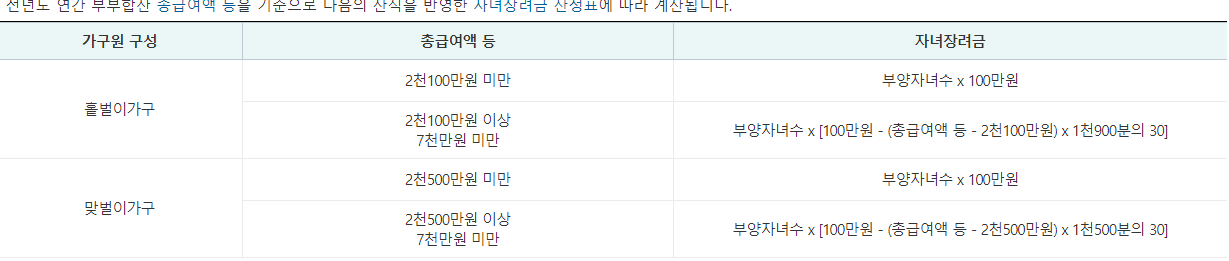 ●기본 지급 금액: 근로자녀장려금의 기본 지급 금액은 연간 소득과 가구 구성원 수에 따라 계산됩니다.